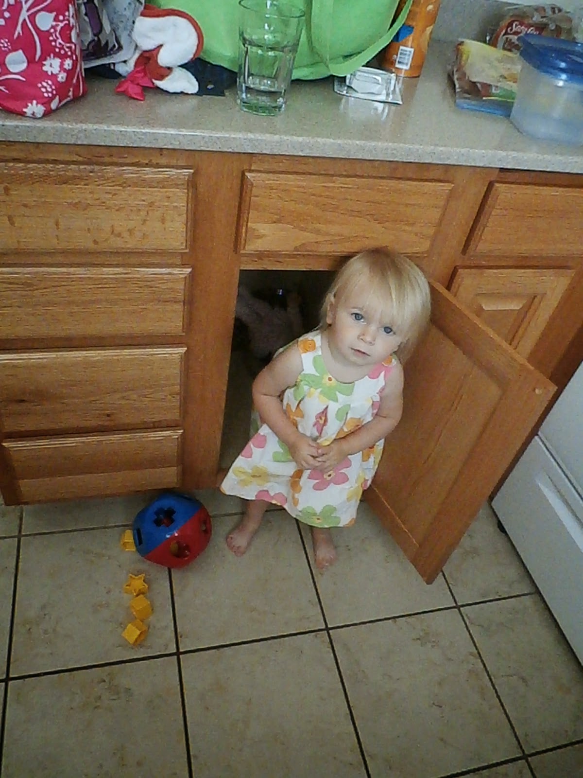 Emma has been a little bored here in TLF, and clingy. She can't really go outside bc there is no closed off space and the steps are too big for her to do by herself. So she gets a little bored...and therefore creative with her playing. So far we have done lots of chasing her around the house, hiding in tents, and now, playing in the cabinet. She also 'reads' to herself, brings me books so I can read with her (as opposed to reading to her), snuggles a lot, and we try to go for lots of walks. She is getting so big and so smart...and ornery. She says all kinds of words, and sentences we think. If only we could understand them. Sometimes we can make out a word and we get really excited. Some of the things we can understand include, "I frew (threw) it!"(Usually about her binky), I do it!, movie, Elsa (from frozen), eat (when she is hungry), sorry, oh, um (when you ask her a question), think think (when some electronic thing is taking too long), choc (chocolate), and hit (she got in trouble for hitting so she now