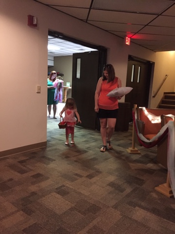 ( I can't wait to see all of his pictures; he especially got a few good ones of Emma. I took some for the blog and to send to Steven.) Then they cut the cake, with a sword...Sting, from LOTR, for those who know the movies. Then they had the receiving line and their first dances. Everyone had a great time, and Faith and her friend, Alan, stole the show on the dance floor. Emma loved watching them. With no nap and lots of strange people, then having to behave at dinner time for pictures, and loud music, Emma was not feeling the reception for a while. But she found some friends to dance with, and the bride and groom and Faith and Alan came out to the lobby to dance with her, where it was quieter. After that she caught a second wind and pulled Faith, then Grandma Joy out to the dance floor, and danced until the music ended. She also helped us clean up, and carried all the little plants up the stairs. She was quite a trooper the whole night. Grace and Andrew both seemed to enjoy themselves, and even fairly relaxed. I wish I had a picture of Tory, hiding from all the people in the bridal room, just like when she was 9, the flower girl at our wedding. My dad's lights were all fabulous, and it was so nice to see so many from his family there. We were all exhausted that evening after cleaning up...just beginning to realize how tired our feet were. Oh...and Emma was very tired and apparently thought she needed even more help staying awake...she pulled the fire alarm. My dad turned it off, but the FD still has to come. So we gave them the rest of the cake.